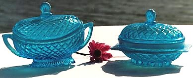 This design (left) by Davidsons is clear blue without the pearline white edge. It was introduced when "pearline" was becoming less popular in 1908. Its registration number was 533040, and this number was stamped into the moulds, so it can almost always be found if you run your finger gently over the glass. It was produced
